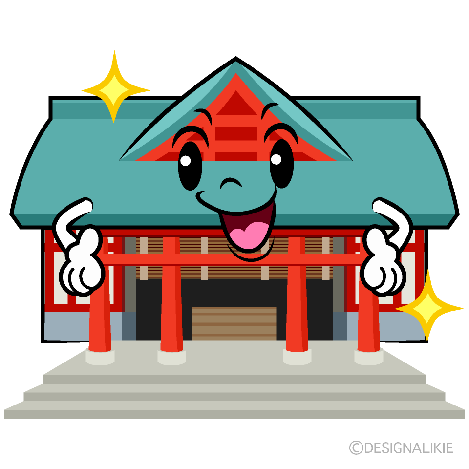 自信満々にポーズする、可愛い神社本殿のデザインが魅力!、無料で使える初詣のお正月イラスト素材です。