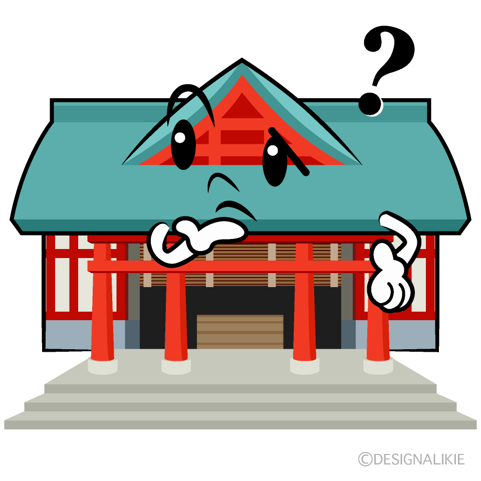 考え込む、可愛い神社本殿のデザインが魅力!、無料で使える初詣のお正月イラスト素材です。
