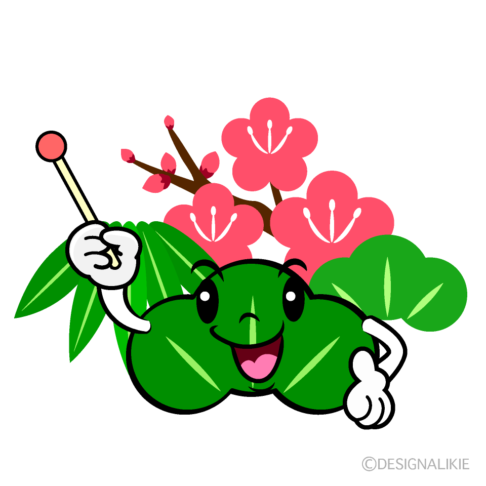 指示棒で説明する、可愛い縁起物の松竹梅のデザインが魅力!、無料で使えるお正月イラスト素材です。