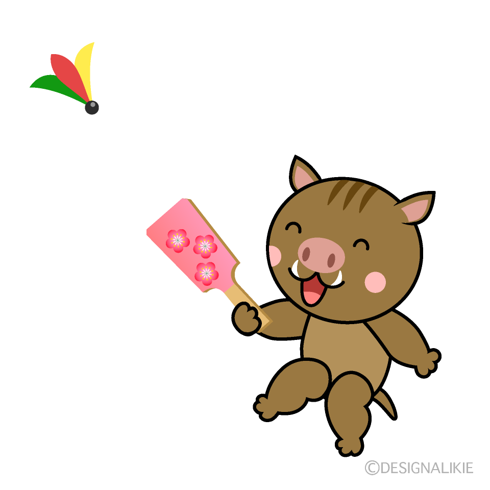 着物で羽根付きする猪